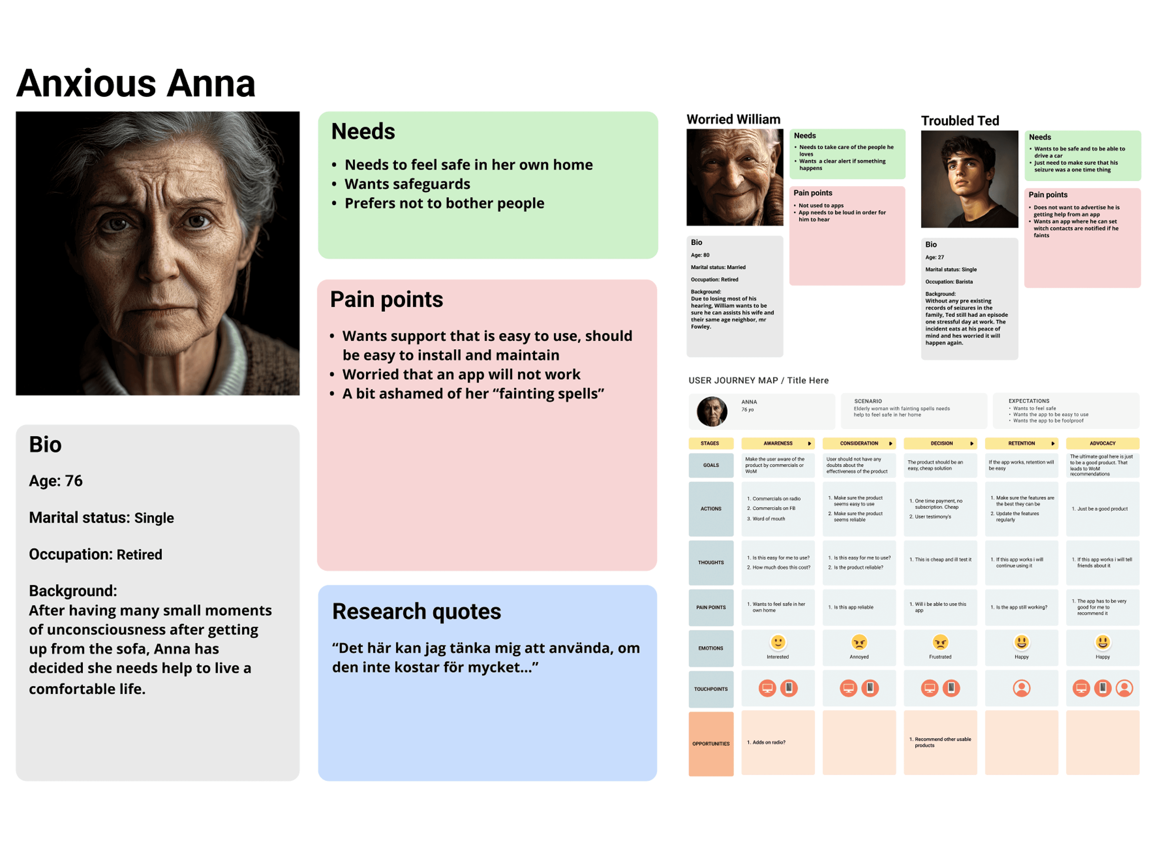 Jag hade tur att det bodde många pensionärer i min byggnad och tog chansen att få göra djup research. Det jag fick fram ur de fyra testerna jag gjorde var att font storleken var för liten, att det fanns en djup oro för om tekniken verkligen fungerade och att appen gärna skulle vara en engångskostnad. Jag byggde en funktion för att testa appen och om appen någonsin skapas ska den inte byggas med en subscription metod.